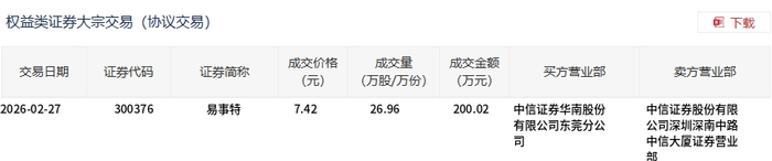 2月13日,易事特(维权)大宗交易成交102.08万股,成交额619.63万元,占当日总成交额的4.54%,成交价6.07元,较市场 收盘价6.74元折价9.94%。 | 交易日期 | 证券代码 | 证券简称 | 成交价格 (元) | 成交星 | 成交全额 (万元) | 买方营业部 | 卖方营业部 | | --- | --- | --- | --- | --- | --- | --- | --- | | | | | | (万股/万份) | | | | | 2026-02-13 | 300376 | 易事特 | 6.07 | 102.08 | 619.63 | 东莞证券股份有限 | 中信证券股份有限 | | | | | | | | 公司东莞大岭山证 | 公司深圳深南中路 | | | | | | | | 券营业部 | 中信大厦证券营业 | | | | | | | | | ਸੀ | ...