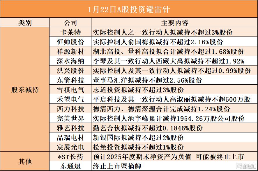 | | | 1月22日A股投资避雷针 | | --- | --- | --- | | 类别 | 公司 | 主要内容 | | | 卡莱特 | 实际控制人之一致行动人拟减持不超过3%股份 | | | 恒师股份 | 实际控制人俞国梅拟减持不超过2.16%股份 | | | 祥源新材 | 湖北高投、量科高投拟合计减持不超过1.68%股份 | | | 深水海纳 | 李琴及其一致行动人西藏大禹拟减持不超过1.92% | | | 洪兴股份 | 实际控制人及其一致行动人拟减持不超过0.99%股份 | | | 东箭科技 | 董事马汇洋拟减持不超过2.56%股份 | | 股东减持 | 雪祺电气 | 志道投资拟减持不超过3%股份 | | | 天望电气 | 平启科技及其一致行动人高淑丽拟减持不超500万股 | | | 西力科技 | 德清西力、德清聚源合计完成减持1.24%股份 | | | 完美世界 | 实际控制人池宇峰累计减持1954. 26万股公司股份 | | | 雅艺科技 | 勤艺合伙拟减持不超过0.1846%股份 | | | 晶瑞电材 | 新银国际拟减持不超过2%股份 | | | 宸展光电 | 松堡投資拟减持不超过1%股份 | ...