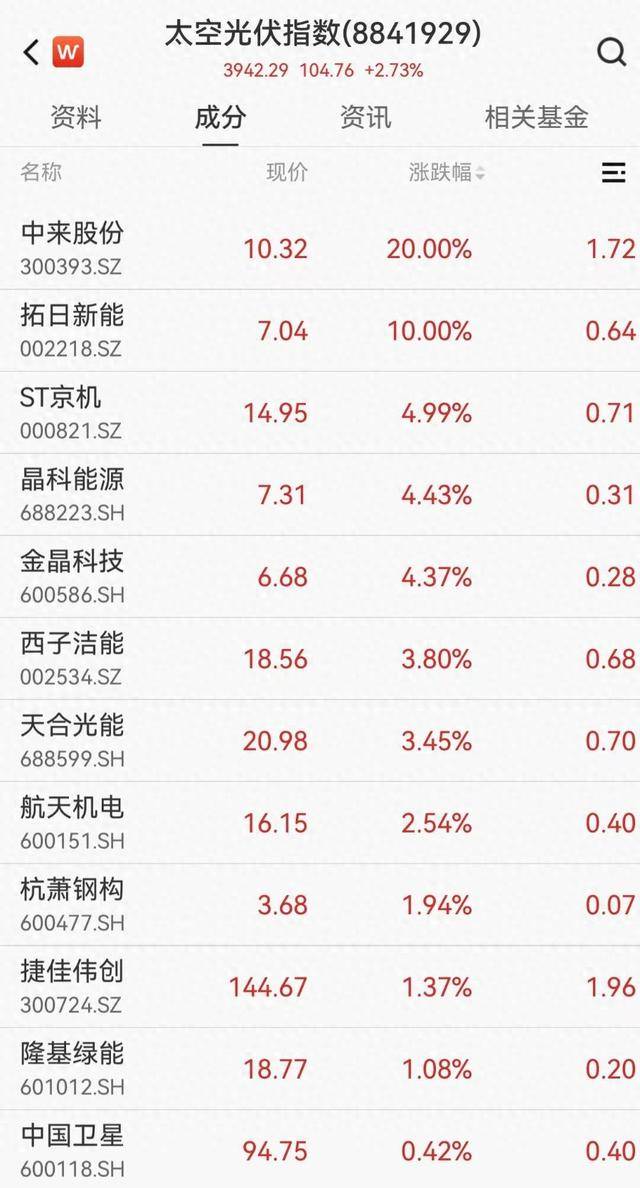 一条传闻,点燃整个板块的情绪 2月4日一早,A股盘面出现一个明显变化。 太空光伏板块突然放量拉升,中来股份快速封住20CM涨停,拓日新能同步涨停,晶科能源、天合光 能、金晶科技集体走强。 | W | 太空光伏指数(8841929) | | | | --- | --- | --- | --- | | | 3942.29 104.76 +2.73% | | | | *** | 成分 | 资讯 | 相关基金 | | 名称 | 现价 | 涨跌幅 = | | | 中来股份 | 10.32 | 20.00% | 1.72 | | 300393.SZ | | | | | 拓昌新能 | 7.04 | 10.00% | 0.64 | | 002218.SZ | | | | | ST京机 | 14.95 | 4.99% | 0.71 | | 000821.SZ | | | | | 晶科能源 | 7.31 | 4.43% | 0.31 | | 688223.SH | | | | | 金晶科技 | 6.68 | 4.37% | 0.28 | | 600586.SH | | | | | 西子洁能 | 18.56 | 3.80% | 0 ...