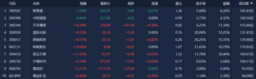 2月12日,三大指数集体收涨,截至收盘,沪指涨0.05%,深成指涨0.86%,创业板指涨1.32%。全市场超3200只个股下跌。 下跌方面,大消费板块集体走弱,影视院线、旅游酒店、零售、食品饮料等板块跌幅居前,横店影视、海欣食品跌停。 沪深两市成交额2.14万亿,较上一个交易日放量1575亿。 个股方面,新易盛全天成交额165亿元位居沪深两市第一,中际旭创、天孚通信、蓝色光标等成交额居前。 | 代码 | 名称 | 涨幅 | 最新价 | | | | 虽比 换手率 | 【 振幅 成交额 ▼ | | | --- | --- | --- | --- | --- | --- | --- | --- | --- | --- | | 1 300502 | 新易盛 | -1.59% | 365.76 | -5.90 | -0.01% | 1.26 | 5.04% | 6.26% | 165.43亿 | | 2 300308 | 中际旭创 | -0.84% | 527.46 | -4.45 | 0.00% | 0.99 | 2.73% | 4.32% | 160.56亿 | | 3 300394 | 天孚通信 | +14.38 ...