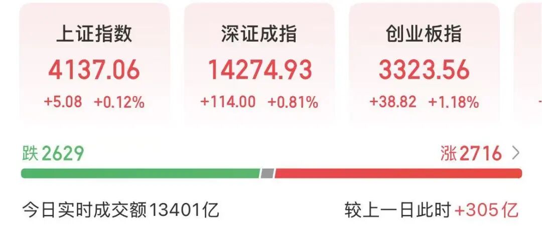 2026.02. 12 本文字数:1155,阅读时长大约2分钟 作者 | 一财阿驴 10:38 沪深两市成交额突破1万亿元。 10:23 电力板块震荡拉升,晋控电力涨停,豫能控股2连板,闽东电力、赣能股份、涪陵电力走高。 11:32 A股午盘丨创业板指半日涨超1%,电网设备板块走高 沪指涨0.12%,深成指涨0.8%,创业板指涨1.18%,科创综指涨0.93%。小金属、电网设备、特高 压板块走强,半导体板块表现活跃,影视院线、短剧游戏板块跌幅居前。截至午盘,全市场超2700 只个股上涨。 | 代码 | 名称 | 现价 | 涨跌 | 涨跌幅 | | --- | --- | --- | --- | --- | | 000001 上证指数 | | 4137.06 | 5.07 | 0.12% | | 399001 | 深证成指 | 14274.93 113.99 | | 0.80% | | 881001 万得全A | | 6839.37 | 36.95 | 0.54% | | 000680 | 科创综指 | 1804.89 | 16.67 | 0.93% | | 399006 | 创业板指 | 3323.56 | ...
