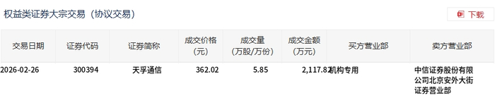 | 权益类证券大宗交易 (协议交易) | | | | | | | 团 下载 | | --- | --- | --- | --- | --- | --- | --- | --- | | 交易日期 | 证券代码 | 证券简称 | 成交价格 (元) | 成交量 (万股/万份) | 成交金额 (万元) | 买方营业部 | 卖方营业部 | | 2026-02-26 | 300394 | 天孚通信 | 362.02 | 5.85 | 2,117.8 机构专用 | | 中信证券股份有限 | | | | | | | | | 公司北京安外大街 | | | | | | | | | 证券营业部 | 2月26日,天孚通信大宗交易成交5.85万股,成交额2117.82万元,占当日总成交额的0.14%,成交价 362.02元,较市场收盘价362.02元持平。 ...