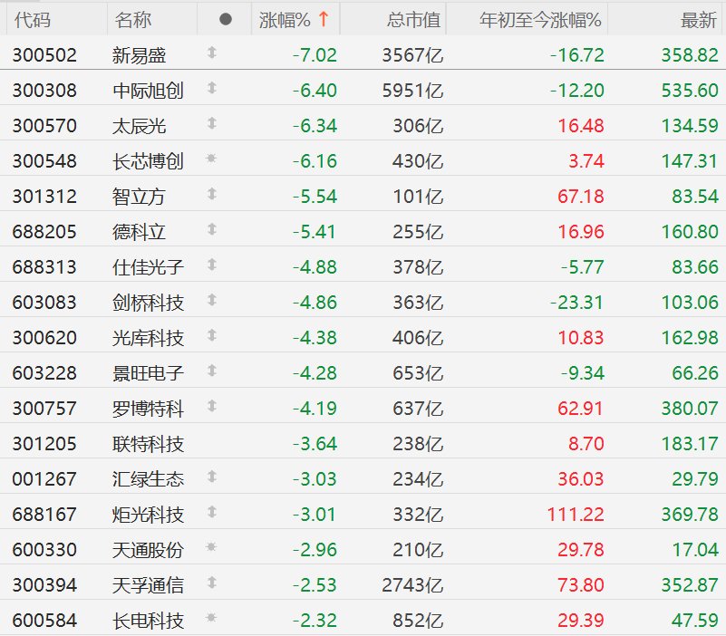 股票频道更多独家策划、专家专栏,免费查阅>> 责任编辑:栎树 | 代码 | 名称 | | 涨幅%↑ | 总市值 | 年初至今涨幅%。 | | | --- | --- | --- | --- | --- | --- | --- | | 300502 | 新易盛 | 1 | -7.02 | 3567 乙 | -16.72 | 358.82 | | 300308 | 中际旭创 | 1 | -6.40 | 5951亿 | -12.20 | 535.60 | | 300570 | 太辰光 | 1 | -6.34 | 306亿 | 16.48 | 134.59 | | 300548 | 长芯博创 | 报 | -6.16 | 430亿 | 3.74 | 147.31 | | 301312 | 智立方 | 1 | -5.54 | 101亿 | 67.18 | 83.54 | | 688205 | 德科立 | 1 | -5.41 | 255亿 | 16.96 | 160.80 | | 688313 | 仕佳光子 | 1 | -4.88 | 378亿 | -5.77 | 83.66 | | 603083 | 剑桥科技 | 1 | ...