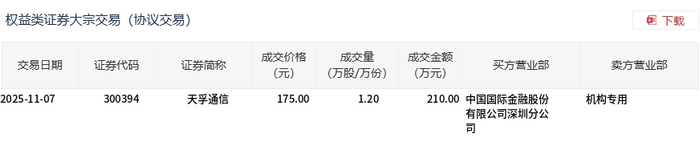 Group 1 - The core point of the news is that Tianfu Communication executed a block trade of 12,000 shares on November 7, with a transaction value of 2.1 million yuan, representing 0.02% of the total trading volume for the day, and the transaction price was 175 yuan, which was flat compared to the market closing price of 175 yuan [1][2] Group 2 - The block trade occurred on November 7, 2025, with the stock code 300394 for Tianfu Communication [2] - The transaction price was 175.00 yuan per share, with a total volume of 1.2 million shares traded [2] - The total transaction amount was 210.00 million yuan, with the buyer being China International Capital Corporation's Shenzhen branch and the seller being an institutional client [2]