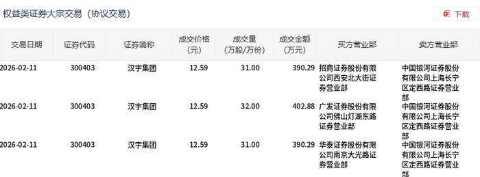 | 交易日期 | 证券代码 | 证券简称 | 成交价格 | 成交量 | 成交全额 (万元) | 买方营业部 | 卖方营业部 | | --- | --- | --- | --- | --- | --- | --- | --- | | | | | (元) | (万股/万份) | | | | | 2026-01-23 | 300403 | 汉字集团 | 13.27 | 25.00 | | 331.75 中信证券股份有限 | 中国银河证券股份 | | | | | | | | 公司苏州分公司 | 有限公司上海长宁 | | | | | | | | | 区定四通业务宫业 | | 2026-01-23 | 300403 | 汉宇集团 | 13.27 | 19.00 | | 252.13 华泰证券股份有限 | नी 中国银河证券股份 | | | | | | | | 公司南京分公司 | 有限公司上海长宁 | | | | | | | | | 区定西路证券营业 | | 2026-01-23 | 300403 | 汉宇集团 | 13.27 | 15.10 | 200.38 机构专用 | | at 中国银河证券股份 | | | | | ...