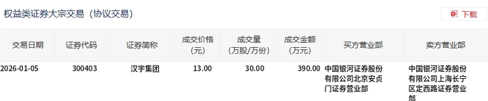 1月5日,汉宇集团大宗交易成交30万股,成交额390万元,占当日总成交额的1.17%,成交价13元,较 市场收盘价14.43元折价9.91%。 | 证券代码 | 证券简称 | 成交价格 | 成交量 | 成交金额 | 买方营业部 | | --- | --- | --- | --- | --- | --- | | 权益类证券大宗交易 (协议交易) 交易日期 | | [ | /TOO IT/A) /T"=1 | | | | 交易日期 | 证券代码 | 证券简称 | PA- MILE | HANDA SER | 1400 - 300 HA 买方营业部 | 卖方营业部 | | --- | --- | --- | --- | --- | --- | --- | | | | | (元) | (万股/万份) | (万元) | | | 026-01-05 | 300403 | 汉宇集团 | 13.00 | 30.00 | 390.00 中国银河证券股份 | 中国银河证券股份 | | | | | | | 有限公司北京安贞 | 有限公司上海长宁 | | | | | | | 门证券营业部 | 区定西路证券营业 | | | | | | ...