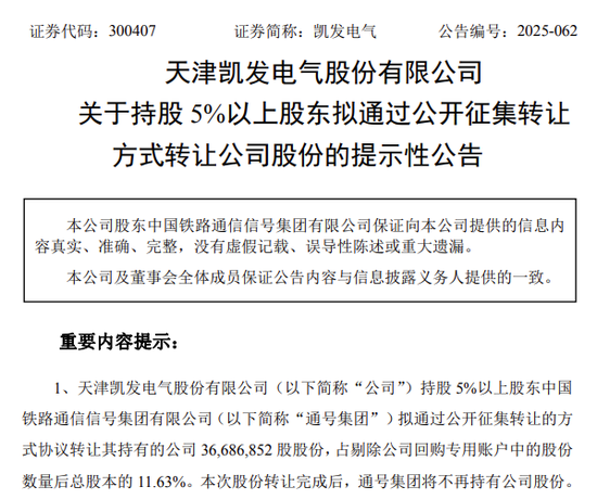 证券代码:300407 证券简称:凯发电气 公告编号:2025-062 天津凯发电气股份有限公司 关于持股 5%以上股东拟通过公开征集转让 方式转让公司股份的提示性公告 通号集团目前直接持有公司 36,686,852 股股份,占剔除公司回购专用账户中 股份数量(2,851,349 股)后总股本 315,349,144 股的 11.63%,该部分股票均为无 限售条件股。通号集团拟通过公开征集转让的方式协议转让其持有的公司 36,686,852 股股份,占剔除公司回购专用账户中的股份数量后总股本的 11.63% (以下简称"本次公开征集转让")。在此期间,公司如有送股、资本公积转增股 本等股本变动事项,公开征集转让股份数量进行相应调整。 根据《上市公司国有股权监督管理办法》,本次公开征集转让的价格不低于 提示性公告日(2025 年 11 月 26 日)前 30 个交易日的每日加权平均价格的算术 平均值及最近一个会计年度公司经审计每股净资产值两者之中的较高者。本次公 开征集转让完成前,如果公司发生派息、送股、资本公积金转增股本、配股等除 权、除息事项,则转让价格相应调整。本次拟转让股份的最终转让价格将依据相 关法规 ...