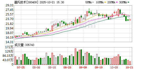 道氏技术10月21日现20笔大宗交易 总成交金额8228.62万元 其中机构买入2209.17万元 溢价率为-9.67%