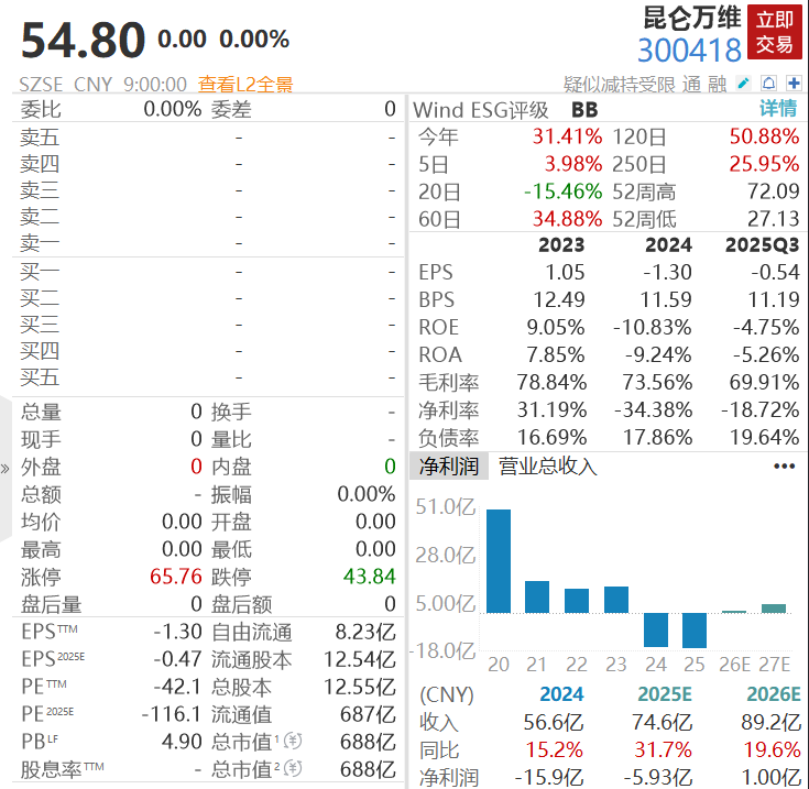 热点栏目 自选股 数据中心 行情中心 资金流向 模拟交易 客户端 炒股就看金麒麟分析师研报,权威,专业,及时,全面,助您挖掘潜力主题机会! 当国内互联网巨头为抢占流量入口在春节红包大战中激烈厮杀时,一家中国AI企业却选择在海外市场 悄然布局,并迎来突破性进展。 昆仑万维(维权)(300418.SZ)曾高喊"All in AI",也是国内率先推出对标ChatGPT大模型的企业。 2026年1月底,这家公司交出了2025年的业绩预告:归属于上市公司股东的净利润亏损13.5亿元至19.5亿 元,扣除非经常性损益后的净利润亏损14.48亿元至20.48亿元,延续了上年的亏损状态。 但另一组数据却呈现出增长态势:2025年公司收入预计同比增长超过40%,其中海外收入占比进一步提 升。 这背后,是公司放弃在通用大模型基础层与"大厂"进行资本和资源的正面消耗战,转而将资源倾斜至应 用生态构建、垂直领域深耕与海外市场扩张,力图将前沿AI技术转化为可规模化的具体产品和现金 流。 其生存逻辑不在于短期盈利,而在于能否在技术浪潮中精准卡位,用持续的投入换取未来的市场席位和 生态优势。 持续烧钱竞速 昆仑万维业务范围覆盖AGI与AI ...
