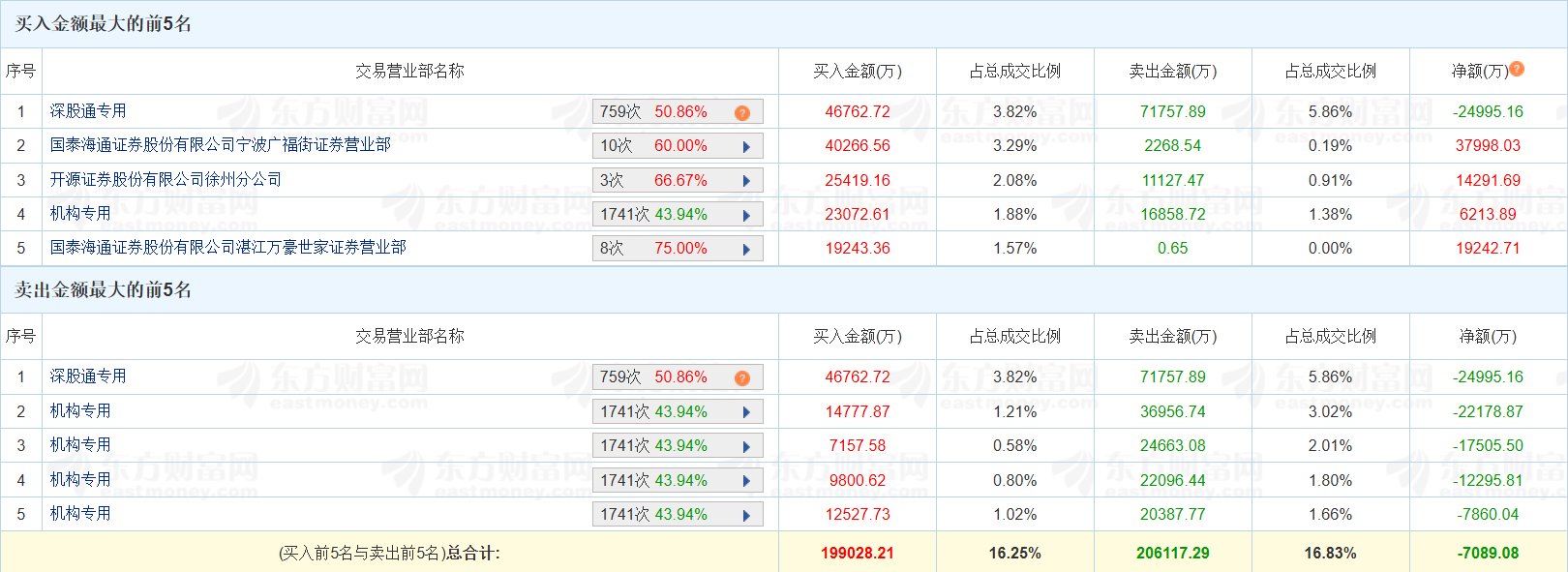 | | 买入金额最大的前5名 | | | | | --- | --- | --- | --- | --- | | 序号 | 交易营业部名称 | | 买人金额(万) | 占总成交比例 | | 1 | 深股通专用 | 759次 50.86% 2 | 46762.72 | 3.82% | | 2 | 国泰海通证券股份有限公司宁波广福街证券营业部 | 10次 60.00% | 40266.56 | 3.29% | | 3 | 开源证券股份有限公司徐州分公司 | 3次 66.67% | 25419.16 | 2.08% | | 4 | 机构专用 | 1741次 43.94% | 23072.61 | 1.88% | | 5 | 国泰海通证券股份有限公司湛江万豪世家证券营业部 | 8次 75.00% | 19243.36 | 1.57% | 昆仑万维(维权)(300418.SZ)今日20CM涨停两连板,换手率15.82%,成交额122.5亿元。龙虎榜数据显示,深股通买入4.68亿元,卖出7.18亿元,净卖出2.5 亿元;五家机构买入6.73亿元,卖出12.1亿元,净卖出5.36亿元;游资"章盟主"位列买二席位,净买入3. ...