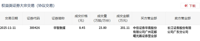 华智数媒11月11日现1笔大宗交易 总成交金额201.11万元 溢价率为-8.55%