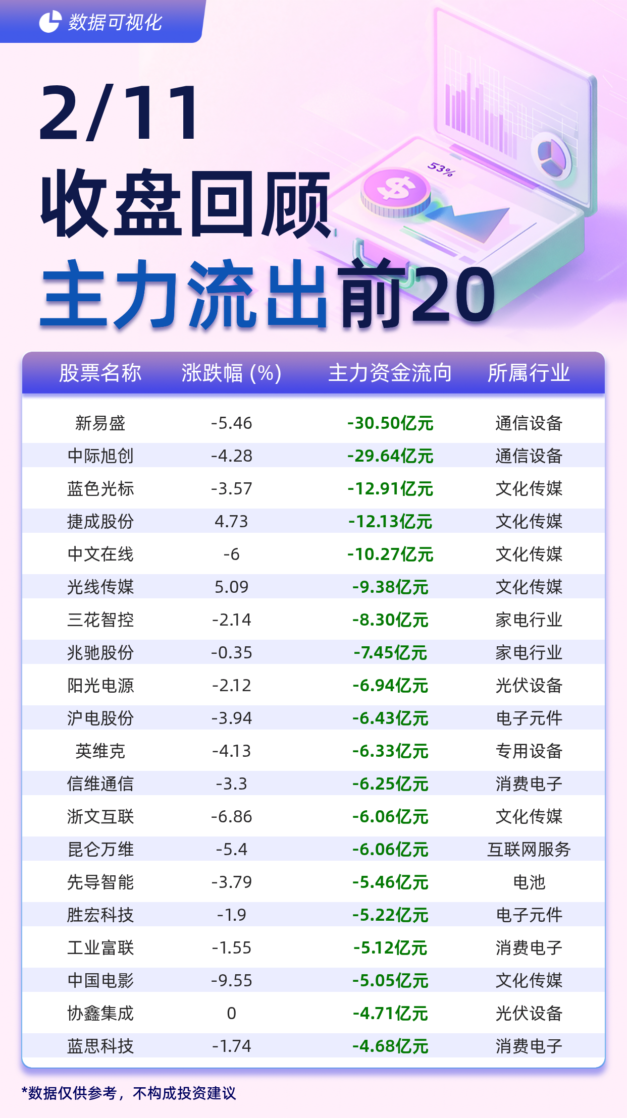 | 股票名称 | 涨跌幅(%) | 主力资金流向 | 所属行 | | --- | --- | --- | --- | | 新易盛 | -5.46 | -30.50亿元 | 通信设备 | | 中际旭创 | -4.28 | -29.64亿元 | 通信设; | | 蓝色光标 | -3.57 | -12.91亿元 | 文化传史 | | 捷成股份 | 4.73 | -12.13亿元 | 文化传媒 | | 中文在线 | -6 | -10.27亿元 | 文化传媒 | | 光线传媒 | 5.09 | -9.38亿元 | 文化传媒 | | 三花智控 | -2.14 | -8.30亿元 | 家电行业 | | 兆驰股份 | -0.35 | -7.45亿元 | 家电行! | | 阳光电源 | -2.12 | -6.94亿元 | 光伏设备 | | 沪电股份 | -3.94 | -6.43亿元 | 电子元件 | | 英维克 | -4.13 | -6.33亿元 | 专用设备 | | 信维通信 | -3.3 | -6.25亿元 | 消费电- | | --- | --- | --- | --- | | 浙文互联 | -6.86 | -6.06 ...