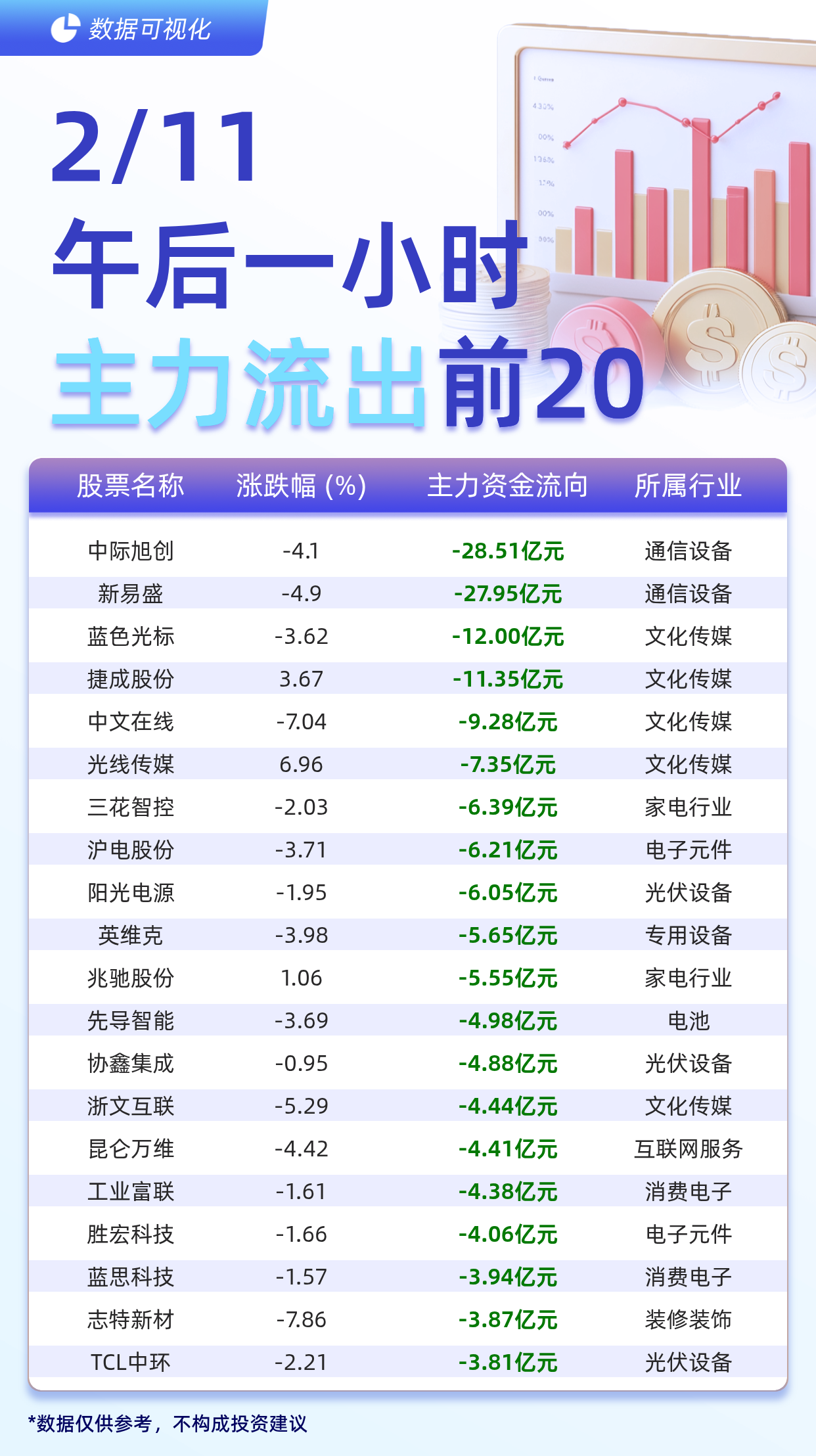 据交易所数据显示,截至2月11日午后一小时,主力资金流出前20的股票分别为: 中际旭创(-28.51亿元)、 新易盛(-27.95亿元)、 蓝色光标(-12.00亿 元)、 捷成股份(-11.35亿元)、 中文在线(-9.28亿元)、 光线传媒(-7.35亿元)、 三花智控(-6.39亿元)、 沪电股份(-6.21亿元)、 阳光电源(-6.05 亿元)、 英维克(-5.65亿元)、 兆驰股份(-5.55亿元)、 先导智能(-4.98亿元)、 协鑫集成(-4.88亿元)、 浙文互联(-4.44亿元)、 昆仑万维(-4.41亿 元)、 工业富联(-4.38亿元)、 胜宏科技(-4.06亿元)、 蓝思科技(-3.94亿元)、 志特新材(-3.87亿元)、 TCL中环(-3.81亿元)。 *数据仅供参考,不构成投资建议 | 股票名称 | 涨跌幅 (%) | 主力资金流向 | 所属行 | | --- | --- | --- | --- | | 中际旭创 | -4.1 | -28.51亿元 | 通信设备 | | 新易盛 | -4.9 | -27.95亿元 | 通信设备 | | 蓝色光标 | -3.62 | -12.00亿 ...