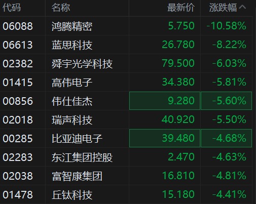 | 代码 | 名称 | 最新价 | 涨跌幅 ^ | | --- | --- | --- | --- | | 06088 | 倒蝶糖製 | 5.750 | -10.58% | | 06613 | 蓝思科技 | 26.780 | -8.22% | | 02382 | 舜宇光学科技 | 79.500 | -6.03% | | 01415 | 高伟电子 | 34.380 | -5.81% | | 00856 | 伟仕佳杰 | 9.280 | -5.60% | | 02018 | 瑞声科技 | 40.920 | -5.50% | | 00285 | 比亚迪电子 | 39.480 | -4.68% | | 02283 | 东江集团控股 | 2.470 | -4.63% | | 02038 | 富智康集团 | 16.810 | -4.81% | | 01478 | 丘钛科技 | 15.180 | -4.41% | 港股苹果概念股集体下挫,其中,鸿腾精密跌超10%,蓝思科技跌超8%,舜宇光学跌6%,高伟电子跌 5.8%,瑞声科技、伟仕佳杰跌5.5%,比亚迪电子、富智康集团、丘钛科技跌超4%以上。 消息上,有分析称,港股市场科 ...