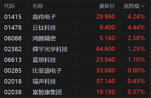 苹果有望超越三星,重登全球手机销冠!苹果概念股普涨,丘钛科技、高伟电子涨超4%,鸿腾精密涨2.6%,舜宇光学、蓝思科技涨超1%