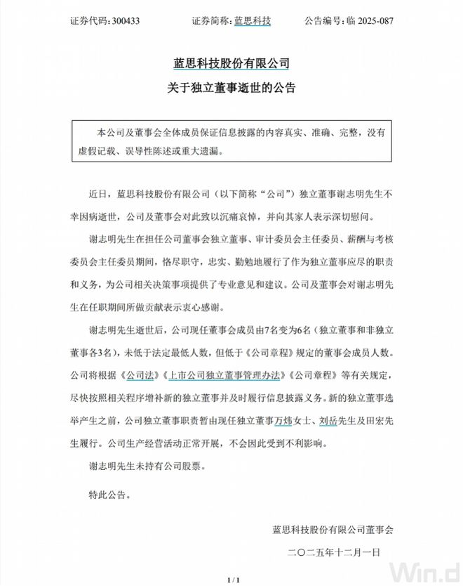 每经记者|陈鹏丽 每经编辑|陈柯名 陈旭 12月1日晚间,千亿市值"果链"龙头蓝思科技发布公告称,近日公司独立董事谢志明不幸因病逝世,公司及董事会对此致以沉痛哀悼,并向其家人表示深 切慰问。 除了担任蓝思科技独董,谢志明还是公司审计委员会主任委员、薪酬与考核委员会主任委员。谢志明逝世后,公司现任董事会成员由7名变为6名(独立董 事和非独立董事各3名),公司将尽快按照相关程序增补新的独立董事并及时履行信息披露义务。 《每日经济新闻》记者留意到,谢志明于2024年12月被选举为蓝思科技的独立董事,当时他还未取得独立董事资格证书,并承诺参加最近一次独立董事培 训并取得深圳证券交易所认可的独立董事资格证书。 谢志明出生于1972年9月,现年53岁,籍贯湖南湘阴,是会计学博士、博士生导师,中国注册会计师。他2003年9月起任长沙理工大学经济与管理学院副教 授、MBA中心主任、教授。2015年至2023年间先后兼任湖南省财政厅管理会计咨询专家,湖南省人大财经委咨询专家,湖南省科技厅项目评审专家以及 国家社科基金委评审专家。 根据公司三季报,今年前三季度,蓝思科技实现营收536.63亿元,同比增长16.08%;归母净利润2 ...