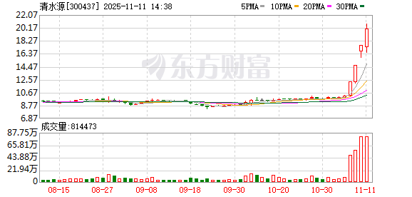 11月11日,清水源涨5.23%,截至发稿,报18.51元/股,成交11.00亿元,换手率36.15%,总市值46.72亿 元。清水源股价已经连续7天上涨,区间累计涨幅82.47%。 金元顺安元启灵活配置混合(004685)成立日期2017年11月14日,最新规模14.32亿。今年以来收益 44.18%,同类排名1510/8147;近一年收益46.33%,同类排名804/8056;成立以来收益573.35%。 金元顺安元启灵活配置混合(004685)基金经理为缪玮彬。 截至发稿,缪玮彬累计任职时间8年333天,现任基金资产总规模14.32亿元,任职期间最佳基金回报 567.57%, 任职期间最差基金回报-28.79%。 风险提示:市场有风险,投资需谨慎。本文为AI大模型自动发布,任何在本文出现的信息(包括但不 限于个股、评论、预测、图表、指标、理论、任何形式的表述等)均只作为参考,不构成个人投资建 议。 责任编辑:小浪快报 资料显示,河南清水源科技股份有限公司位于河南省济源市虎岭高新区科工路与文博路交叉口西100 米,成立日期1995年6月8日,上市日期2015年4月23日,公司主营业务涉及水处理剂及衍生品生 ...