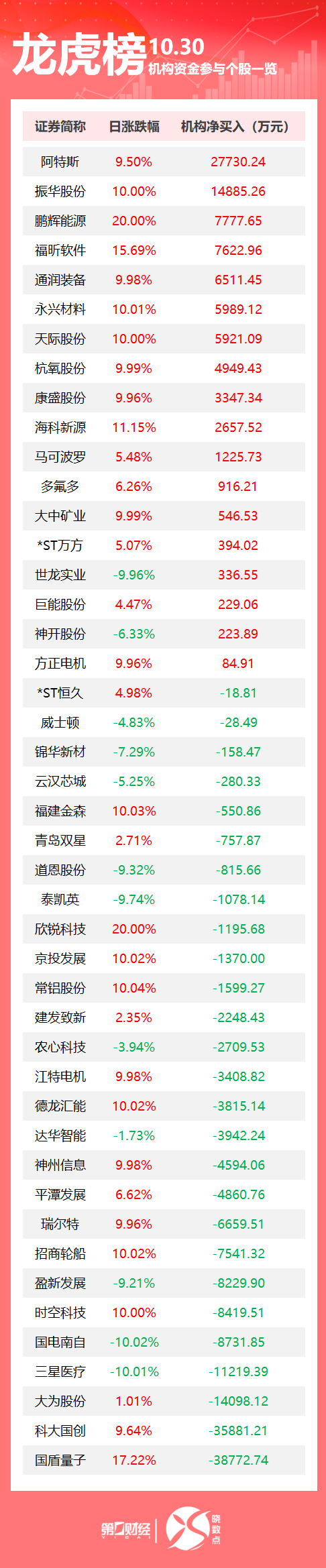 龙虎榜机构热股 今天机构龙虎榜上榜40只个股,净买入16只,净卖出24只。当日机构买入最多的个股前三位是:阿特斯 (3日2.77亿)、振华股份(3日1.49亿)、鹏辉能源(7777万)。 龙虎榜知名游资 一、固态电池、六氟磷酸锂 上海有色数据显示,10月30日,六氟磷酸锂平均价格为10.3万元/吨,较上一个交易日上涨2.49%。而在 9月30日,该品种平均价格为6.33万元/吨。 国金证券认为,市场现货难寻,下游企业拿货情绪急切,对高价订单接受度较高。行业内部对价格进行 讨论,有意推至高位,六氟磷酸锂现货价格大幅上涨。行业满产但提量慢,复产未放量,供应仍紧。 西藏城投 个股龙虎榜 江特电机 个股龙虎榜 鹏辉能源 龙虎榜显示,今日2家机构净买入7777万。 公司10月30日公告,公司第三季度净利润2.03亿元,同比增长977.24%,主要因储能电芯满产且部分产 品涨价。 个股龙虎榜 国盾量子 个股龙虎榜 *免责声明:文章内容仅供参考,不构成投资建议 *风险提示:股市有风险,入市需谨慎 二、量子科技 10月29日,央企战略性新兴产业发展专项基金启动,。将重点支持人工智能、航空航天、高端装备、量 子科技等战略性新兴 ...