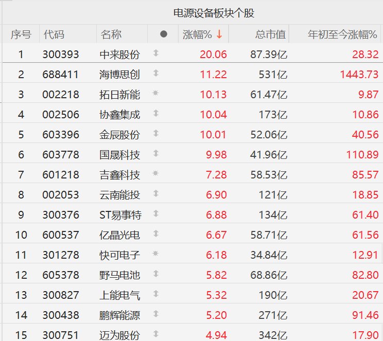 电源设备股集体走强,中来股份20%涨停