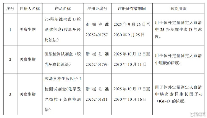 格隆汇10月21日丨美康生物(300439.SZ)公布,近日取得了由浙江省药品监督管理局颁发的《中华人民 共和国医疗器械注册证(体外诊断试剂)》。上述《注册证》的取得,丰富了公司在体外诊断生化及化 学发光细分领域产品线的品种,有利于进一步提升公司的核心竞争力和市场拓展能力,对公司未来的经 营将产生积极影响。 | 序号 | 注册人名称 | 产品名称 | 注册证编号 | 注册证有效期间 | 预期用途 | | --- | --- | --- | --- | --- | --- | | 1 | 美康生物 | 25-羟基维生素 D 检 测试剂盒(胶乳免疫 | 浙 械 注 准 | 2025 年9月 26日至 | 用于体外定量测定人血清 中 25-羟基维生素 D 的浓 | | | | 比浊法) | 20252401757 | 2030年9月25日 | 度。 | | 2 | 美康生物 | 胆酸检测试剂盒(胶 乳免疫比浊法) | 浙 械 注 准 20252401793 | 2025年10月12日至 2030 年 10月 11日 | 用于体外定量测定人血清 中胆酸的浓度。 | | ਤੇ | 美康生物 | 胰岛素样生长因子-I 检 ...