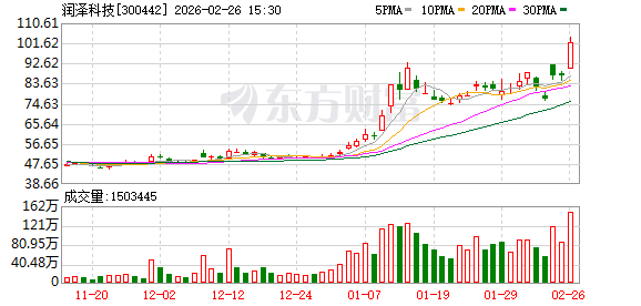 证券日报网讯 2月26日,润泽科技发布公告称,公司股票于2026年2月24日、2026年2月25日、2026年2 月26日连续三个交易日收盘价格涨幅偏离值累计超过30%,根据《深圳证券交易所交易规则(2023年修 订)》,属于股票异常波动的情形。公司董事会确认,除前述事项外,公司目前没有任何根据《深圳证 券交易所创业板股票上市规则》等有关规定应予以披露而未披露的事项或与该事项有关的筹划、商谈、 意向、协议等;董事会也未获悉公司有根据《深圳证券交易所创业板股票上市规则》等有关规定应予以 披露而未披露的、对公司股票及其衍生品种交易价格产生较大影响的信息;公司前期披露的信息不存在 需要更正、补充之处。 (文章来源:证券日报) ...