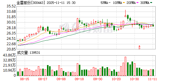 2025 年 11 月 11 日 评级 买入 评级变动 维持 交易数据 | 当前价格(元) | 28.82 | | --- | --- | | 52 周价格区间(元) | 17.46-32.46 | | 总市值(百万) | 9226.28 | | 流通市值(百万) | 6996.75 | | 总股本(万股) | 32013.46 | | 流通股(万股) | 24277.40 | 涨跌幅比较 % 1M 3M 12M 金雷股份 -4.98 25.80 14.55 风电设备 -7.25 18.90 24.11 -34% -14% 6% 26% 46% 2024-11 2025-02 2025-05 2025-08 2025-11 金雷股份 风电设备 袁玮志 分析师 执业证书编号:S0530522050002 yuanweizhi@hnchasing.com 相关报告 1 金雷股份(300443.SZ)公司点评:锻造和铸 造主轴起量,业绩向好 2025-09-05 2 金雷股份(300443.SZ)2024 年年报点评:风 电主轴龙头地位稳固,铸造产能逐渐释放 2025-04-03 3 金雷股份(300443.SZ) ...