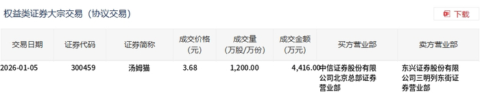 | 权益类证券大宗交易(协议交易) | | --- | 1月5日,汤姆猫大宗交易成交1200万股,成交额4416万元,占当日总成交额的1.2%,成交价3.68元,较 市场收盘价5.34元折价31.09%。 | 交易日期 | 证券代码 | 证券简称 | 成交价格 (元) | 成交量 | 成交金额 (万元) | 买方营业部 | 卖方营业部 | | --- | --- | --- | --- | --- | --- | --- | --- | | | | | | (万股/万份) | | | | | 2026-01-05 | 300459 | 汤姆猫 | 3.68 | 1,200.00 | 4,416.00中信证券股份有限 | 东兴证券股份有限 | | | | | | | | | 公司北京总部证券 公司三明列东街证 | | | | | | | | 营业部 | 券营业部 | | ...