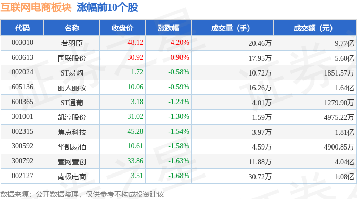 Market Overview - On October 16, the internet e-commerce sector declined by 0.79% compared to the previous trading day, with Xinghui Co., Ltd. leading the decline [1] - The Shanghai Composite Index closed at 3916.23, up 0.1%, while the Shenzhen Component Index closed at 13086.41, down 0.25% [1] Stock Performance - Notable gainers included Ruoyuchen, which rose by 4.20% to a closing price of 48.12, with a trading volume of 204,600 shares and a transaction value of 977 million [1] - Conversely, Xinghui Co., Ltd. saw a significant drop of 6.74%, closing at 7.20, with a trading volume of 445,900 shares and a transaction value of 327 million [2] - Other stocks such as ST Yigou and Liren Lizhuang experienced minor declines of 0.58% and 0.59%, respectively [1][2] Capital Flow - The internet e-commerce sector experienced a net outflow of 219 million from institutional investors, while retail investors saw a net inflow of 219 million [2] - The data indicates that speculative funds had a net inflow of 146,800 [2] Individual Stock Capital Flow - Qingmu Technology had a net inflow of 11.6 million from institutional investors, while it faced a net outflow of 15.9 million from retail investors [3] - Yiwang Yichuang saw a net inflow of 9.25 million from institutional investors but a net outflow of 21.3 million from speculative funds [3] - Focus Technology had a net inflow of 946,600 from retail investors despite a net outflow from institutional and speculative funds [3]