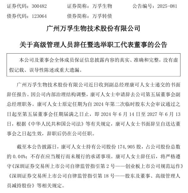 12月29日,万孚生物发布公告称,公司近日收到副总经理康可人女士递交的书面辞任报告,因公司内部 治理结构调整,康可人女士申请辞去公司第五届董事会副总经理职务。 | 证券代码:300482 | 证券简称:万孚生物 | 公告编号:2025-081 | | --- | --- | --- | | 债券代码:123064 | 债券简称:万孚转债 | | 2025年前三季度,万孚生物实现收入16.90亿元,归母净利润1.34亿元。 12月29日,万孚生物发布公告称,公司近日收到副总经理康可人女士递交的书面辞任报告,因公司内部 治理结构调整,康可人女士申请辞去公司第五届董事会副总经理职务。 | 证券代码:300482 | 证券简称:万孚生物 | 公告编号:2025-081 | | --- | --- | --- | | 债券代码:123064 | 债券简称:万孚转债 | | 值得注意的是,辞任后康可人女士仍在公司任职,并未脱离公司管理体系。 12月29日,万孚生物召开2025年第一次职工代表大会,经全体与会职工代表表决,一致同意选举康可人 女士为第五届董事会职工代表董事,任期自本次选举通过之日起至第五届董事会任期届满之日 ...