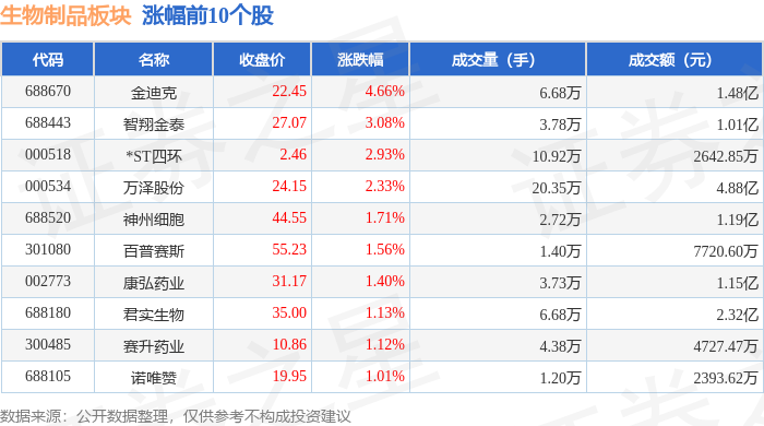 证券之星消息,12月25日生物制品板块较上一交易日上涨0.18%,金迪克领涨。当日上证指数报收于 3959.62,上涨0.47%。深证成指报收于13531.41,上涨0.33%。生物制品板块个股涨跌见下表: | 代码 | 名称 | 收盘价 | 涨跌幅 | 成交量(手) | 成交额(元) | | --- | --- | --- | --- | --- | --- | | 688670 | 金克 | 22.45 | 4.66% | 6.68万 | 1.48亿 | | 688443 | 智翔金泰 | 27.07 | 3.08% | 3.78万 | 1.01亿 | | 000518 | *ST四环 | 2.46 | 2.93% | 10.92万 | 2642.85万 | | 000534 | 万泽股份 | 24.15 | 2.33% | 20.35万 | 4.88亿 | | 688520 | 神州细胞 | 44.55 | 1.71% | 2.72万 | 261T | | 301080 | 百普賽斯 | 55.23 | 1.56% | 1.40万 | 7720.60万 | | 002773 | 康弘药业 | 31.17 ...