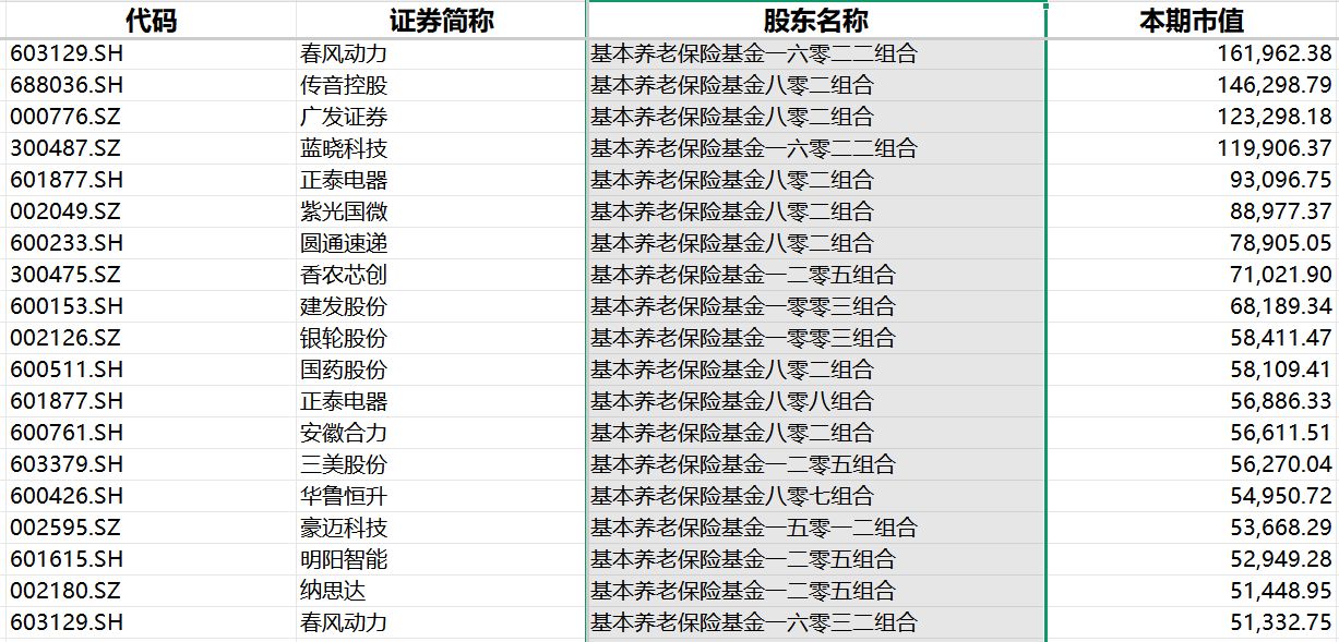 2025 年三季报披露收官,养老基金的持仓动向成为市场焦点。 养老金和社保基金均由全国社保基金理事会负责运作,持仓风格一贯主要集中在盈利稳定、股息率较高的成熟行业。作为追求长期稳健回报的重要资金力 量,养老基金的持仓变化宛如一把标尺,精准衡量着行业景气度和企业价值的变迁,为市场各方提供了关键的投资参考信号。 据东方财富Choice金融终端数据,截至今年三季度末,养老金合计持股量达17.19亿股,持股市值达380.74亿元。 | 代得 | 证券简称 | 股东名称 | | --- | --- | --- | | 603129.SH | 春风动力 | 基本养老保险基金一六零二二组合 | | 688036.SH | 传音控股 | 基本养老保险基金/零二组合 | | 000776.SZ | 广发证券 | 基本养老保险基金八零二组合 | | 300487.SZ | 監院科技 | 基本养老保险基金一六零二二组合 | | 601877.SH | 止泰电器 | 基本养老保险基金/零二组合 | | 002049.SZ | 紫光国微 | 基本养老保险基金八零二组合 | | 600233.SH | 圆通速房 | 基本养老保险基金/零 ...