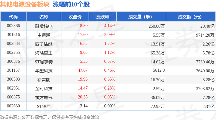 证券之星消息,10月23日其他电源设备板块较上一交易日下跌1.09%,通合科技领跌。当日上证指数报收 于3922.41,上涨0.22%。深证成指报收于13025.45,上涨0.22%。其他电源设备板块个股涨跌见下表: | 代码 | 名称 | 收盘价 | 涨跌幅 | 成交量(手) | 成交额(元) | | | --- | --- | --- | --- | --- | --- | --- | | 300491 | 通合科技 | 32.36 | -4.37% | 15.21万 | | 4.85亿 | | 300693 | 暨弘股份 | 36.15 | -3.52% | 15.56万 | | 5.57亿 | | 002851 | 麦格米特 | 71.00 | -3.02% | 12.09万 | | 8.56亿 | | 002364 | 中恒电气 | 25.99 | -2.88% | 28.36万 | | 7.33亿 | | 002518 | 科士达 | 37.56 | -2.87% | 17.87万 | | 6.66亿 | | 688411 | 海電影创 | 295.33 | -2.36% | 2.25万 | | ...
