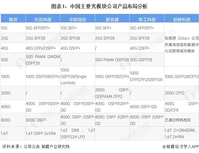 本文核心数据:中国代表性光模块企业产品布局、中国光模块细分产品对比分析 代表性光模块企业产品布局 转自:前瞻产业研究院 以下数据及分析来自于前瞻产业研究院光模块研究小组发布的《全球及中国光模块行业发展前景与投资 战略规划分析报告》。 光模块行业主要上市公司:光迅科技(002281.SZ);中际旭创(300308.SZ);新易盛(300502.SZ);博创科技 (300548.SZ);太辰光(300570.SZ);联特科技(301205.SZ);中天科技(600522.SH);长飞光纤(601869.SH);九联 科技(688609.SH);德科立(688205.SH);剑桥科技(603083.SH)等 光模块按其传输速率可以分为10G光模块、25G光模块、40G光模块、50G光模块、100G光模块、200G 光模块、400G光模块、800G光模块等。目前,国内的主要光模块公司产品线在传输速率上已经覆盖了 在800G及以下的光模块,其覆盖能力具体如下: | 楽目 | 光迅科技 | 中际旭创 | 新易盛 | 华工科技 | 剑桥科技 | | --- | --- | --- | --- | --- | --- | | ...