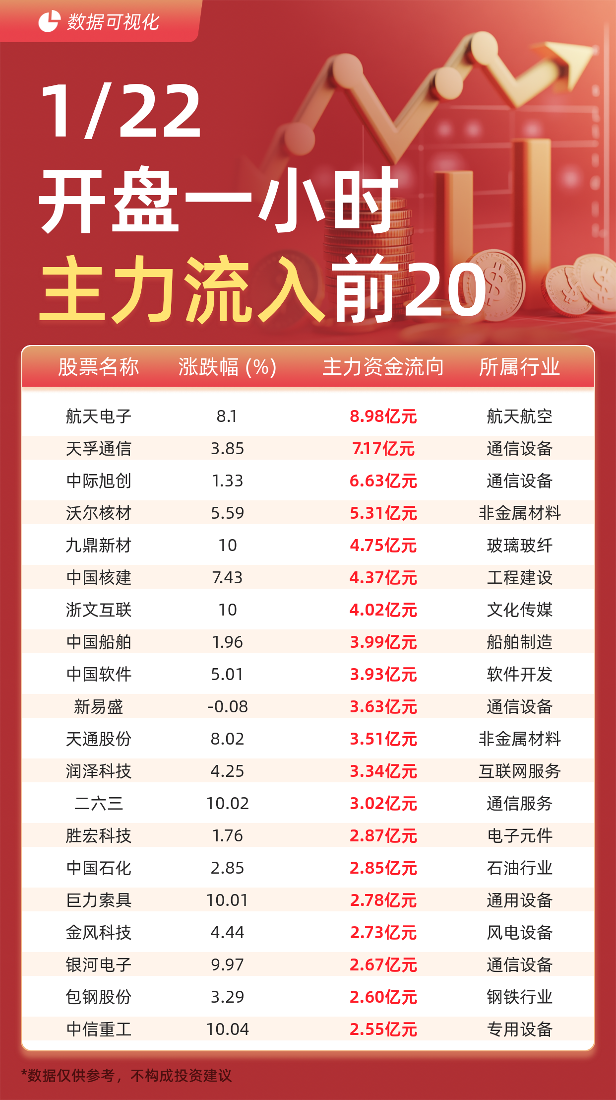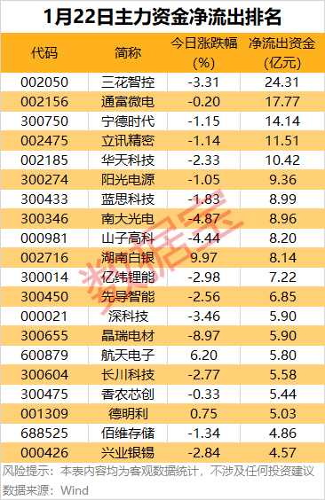 CPO三剑客"易中天" 获主力资金抢筹 14个行业主力资金净流入。 A股三大指数今日(1月22日)集体收涨,行业板块多数上涨,航天航空、采掘行业、船舶制造、玻璃 玻纤、燃气、石油行业、光伏设备、煤炭行业、水泥建材板块涨幅居前,电子化学品、保险板块跌幅居 前。 从今日主力资金情况来看,沪深两市全天主力资金净流出104.42亿元。14个行业主力资金净流入,通 信、国防军工、非银金融行业主力资金净流入金额分别为78.84亿元、29.16亿元、13.71亿元;机械设 备、银行、建筑材料、计算机行业主力资金净流入金额均超4亿元。 17个主力资金净流出行业中,电子、电力设备、有色金属、基础化工行业主力资金净流出金额居前,分 别为79.79亿元、54.2亿元、27.73亿元、20.77亿元; 汽车、家用电器、医药生物行业主力资金净流出金 额均超10亿元。 据数据宝统计,今日有57股主力资金净流出均超2亿元,其中,三花智控、通富微电、宁德时代、立讯 精密、华天科技等净流出金额居前。 | | 1月22日主力资金净流出排名 | | | | --- | --- | --- | --- | | 代码 | 简称 | | 今日涨跌幅 净 ...