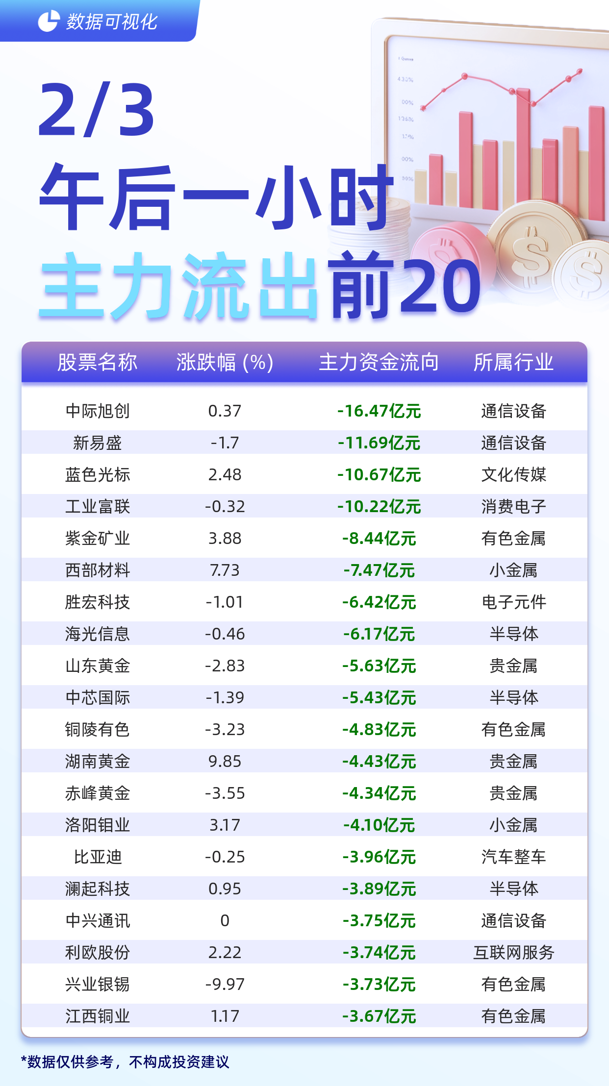 据交易所数据显示,截至2月3日收盘,主力资金流出前20的股票分别为: 中际旭创(-19.09亿元)、 蓝色光标(-11.28亿元)、 新易盛(-11.00亿元)、 工 业富联(-10.44亿元)、 西部材料(-7.27亿元)、铜陵有色(-6.49亿元)、 山东黄金(-6.35亿元)、 海光信息(-6.33亿元)、 中国黄金(-5.75亿元)、 胜宏科技(-5.62亿元)、 兴业银锡(-5.56亿元)、 豫光金铅(-4.92亿元)、 中芯国际(-4.62亿元)、 湖南黄金(-4.48亿元)、 中兴通讯(-4.24亿元)、 赤峰黄金(-3.90亿元)、 小商品城(-3.88亿元)、 华泰证券(-3.84亿元)、 比亚迪(-3.79亿元)、 中金黄金(-3.76亿元)。 | 豫光金铅 | -10.01 | -4.92亿元 | 有色金属 | | --- | --- | --- | --- | | 中芯国际 | -0.88 | -4.62亿元 | 未营体 | | 湖南黄金 | 10 | -4.48亿元 | 贵金属 | | 中兴通讯 | 0.49 | -4.24亿元 | 通信设管 | | 赤峰黄金 | 2.31 | -3 ...