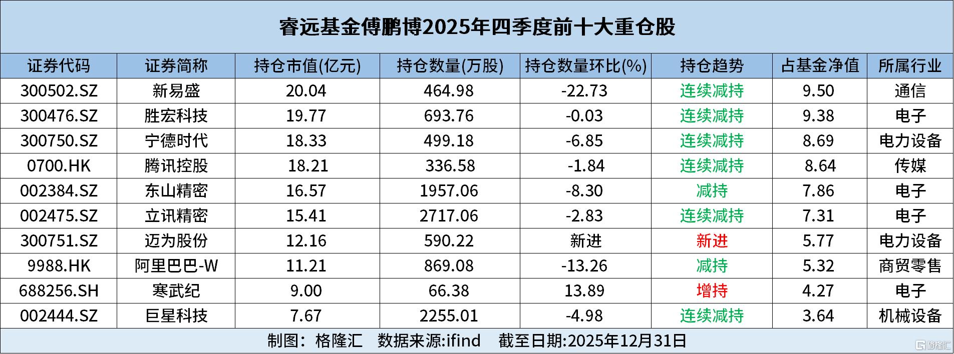 公募基金2025年四季报披露,傅鹏博等知名基金经理2025年四季度调仓情况随之曝光。 2025年四季度,傅鹏博旗下基金前十大重仓股中,迈为股份代替中国移动新进入其前十大重仓股;增持寒武纪;减持新易盛、胜宏科技、宁德时代、腾讯控 股、东山精密、立讯精密、阿里巴巴-W、巨星科技。 | 证券代码 | 证券简称 | 持仓市值(亿元) | 持仓数量(万股) | | --- | --- | --- | --- | | 300502.SZ | 新易盛 | 20.04 | 464.98 | | 300476.SZ | 胜宏科技 | 19.77 | 693.76 | | 300750.SZ | 宁德时代 | 18.33 | 499.18 | | 0700.HK | 腾讯控股 | 18.21 | 336.58 | | 002384.SZ | 东山精密 | 16.57 | 1957.06 | | 002475.SZ | 立讯精密 | 15.41 | 2717.06 | | 300751.SZ | 迈为股份 | 12.16 | 590.22 | | 9988.HK | 阿里巴巴-W | 11.21 | 869.08 | | 6882 ...