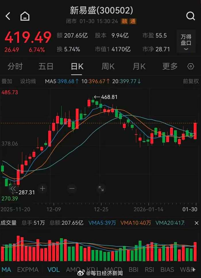【#新易盛预计2025年净利润近百亿#】1月30日,新易盛公告称,预计2025年归属于上市公司股东的净 利润为94亿元至99亿元,比上年同期增长231.24%至248.86%。报告期内,受益于算力投资持续增长, 高速率产品需求快速提升,公司销售收入和净利润大幅增加。(每经,德塔) ...