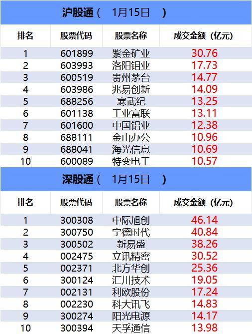 龙虎榜方面,商业航天概念遭重挫,人气股金风科技跌停,两家一线游资(中国银河大连黄河路、国元证券上海虹桥路)合计卖出3.84亿。机构逆势加仓多 只AI应用概念股,其中省广集团获四家机构买入4.94亿,盘中创新高的三维通信获两家机构买入2.79亿,通达海获四家机构买入1.02亿。 | 排名 | 板块名称 | 主力资金净流出 (亿元) | 主力资金净流出率(%) | | --- | --- | --- | --- | | 1 | 计算机 | -233.90 | -6.66 | | 2 | 文化传媒 | -118.54 | -7.24 | | 3 | 国防军工 | -105.95 | -6.71 | | 4 | 医药 | -75.15 | -4.86 | | 5 | 非银金融 | -57.99 | -7.73 | 从主力板块资金监控数据来看,电子板块主力资金净流入居首。 一、沪深股通前十大成交 今日沪股通总成交金额为1510.44亿,深股通总成交金额为2044.34亿。 | | 沖股通 ( | 1月15日 D | | | --- | --- | --- | --- | | 排名 | 股票代码 | 股票名称 | 成交金 ...