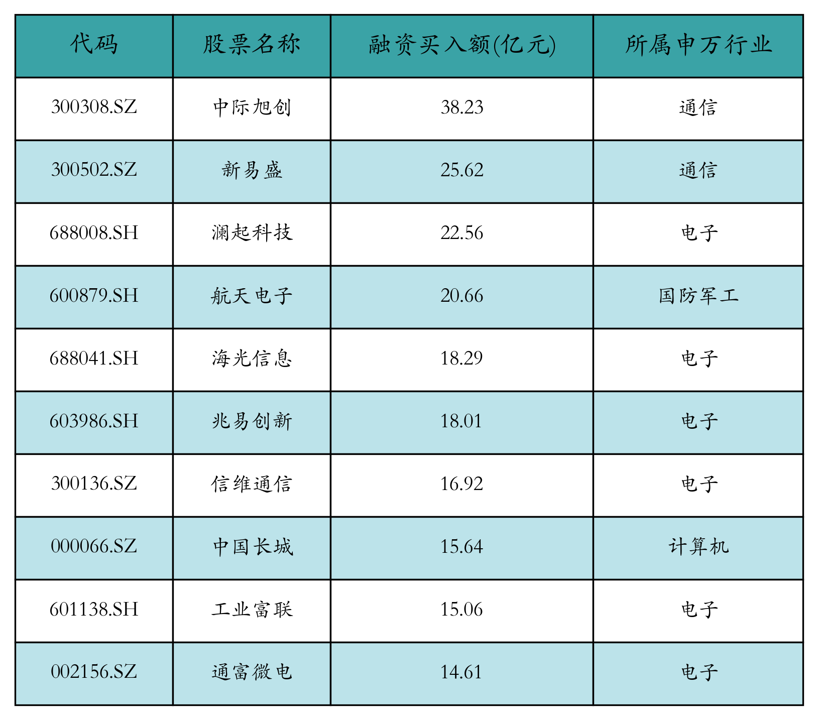 | 代码 | 基金名称 | | --- | --- | | 026568.OF | 天弘悦享臻选三个月持有混合 | | 026569.OF | 天弘悦享臻选三个月持有混合 | 二、融资融券情况 昨日沪深两市的融资融券余额为27159.27亿元,其中融资余额26985.57亿元,融券余额173.7亿元。两市融资融券余额较前一交易日增加39.52亿元。分市场来 看,沪市两融余额为13767.95亿元,相较前一交易日增加21.87亿元;深市两融余额13391.33亿元,相较前一交易日增加17.66亿元。 两市共有3477只个股有融资资金买入,其中中际旭创、新易盛、澜起科技排名前三,买入金额分别38.23亿元、25.62亿元、22.56亿元。融资买入额前10个股 详情见下表: | 代码 | 股票名称 | 融资买入额(亿元 | | --- | --- | --- | | 300308.SZ | 中际旭创 | 38.23 | | 300502.SZ | 新易盛 | 25.62 | | 688008.SH | 澜起科技 | 22.56 | | 600879.SH | 航天电子 | 20.66 | | 688041.SH | ...