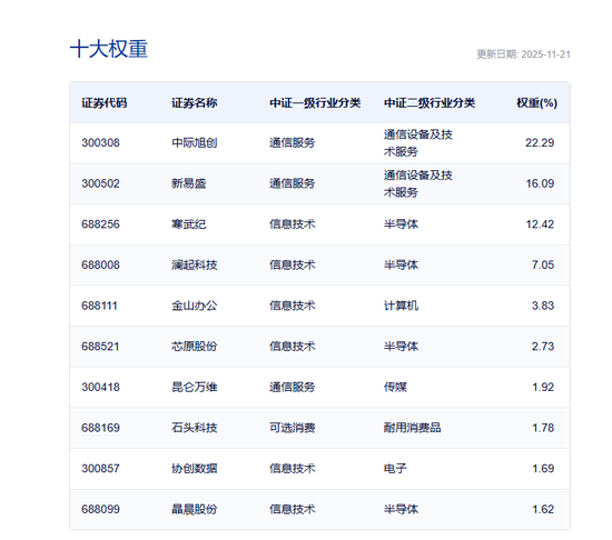 11月21日,16只科技主题产品集中获批,其中部分产品上报当日即获批。当前,多只科技主题基金正在 发行。近期国内外关于AI产业是否存在泡沫的讨论升温,AI产业链相关公司股价震荡,科技板块后续 走势备受关注。 16只科技主题基金同日获批 11月21日,16只科技主题基金集中获批,具体来看,包括华泰柏瑞基金、易方达基金、景顺长城基金等 7家基金公司旗下的科创创业人工智能ETF,这也是首批科创创业人工智能ETF。 中证指数官网显示,中证科创创业人工智能指数从科创板和创业板中选取50只业务涉及为人工智能提供 基础资源、技术以及应用支持的上市公司证券作为指数样本,以反映上述板块中人工智能主题上市公司 证券的整体表现。 科技板块将迎来增量资金。 | 1 | | | | Carl Clark Cuzo-11-21 | | --- | --- | --- | --- | --- | | 证券代码 | 证券名称 | 中证一级行业分类 | 中证二级行业分类 | 权重(%) | | 300308 | 中际旭创 | 通信服务 | 通信设备及技 | 22.29 | | | | | 术服务 | | | 300502 | 新易盛 | 通信 ...