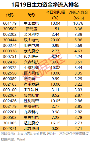 据交易所数据显示,截至1月19日开盘一小时,主力资金流入前20的股票分别为: 中国西电(15.16亿元)、 特变电工(12.98亿元)、 海光信息(6.10亿 元)、 阳光电源(6.07亿元)、 新易盛(5.54亿元)、 双杰电气(5.41亿元)、 保变电气(4.38亿元)、 金风科技(4.12亿元)、 许继电气(3.49亿元)、 拓普集团(3.22亿元)、 巨人网络(3.19亿元)、 深科技(3.10亿元)、 长飞光纤(2.91亿元)、 中国铀业(2.84亿元)、 中控技术(2.79亿元)、 立讯精 密(2.70亿元)、 中国中免(2.67亿元)、 华夏幸福(2.57亿元)、 九鼎新材(2.47亿元)、 亨通光电(2.32亿元)。 | 股票名称 | 涨跌幅 (%) | 主力资金流向 | 所属行 | | --- | --- | --- | --- | | 中国西电 | 10.04 | 15.16亿元 | 电网设备 | | 特变电工 | 7.07 | 12.98亿元 | 电网设备 | | 海米信息 | 3.67 | 6.10亿元 | 米當体 | | 阳光电源 | 1.69 | 6.07亿元 | 光伏设备 | | ...