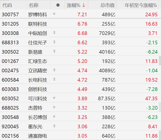 | 代码 | 名称 | | 涨幅% ↓ | 总市值 | 年初至今涨幅% | | --- | --- | --- | --- | --- | --- | | 300757 | 罗博特 | 张 | 7.21 | 489亿 | 24.95 | | 301205 | 联特科技 | | 6.76 | 255亿 | 16.63 | | 300308 | 中标旭创 | 1 | 6.68 | 7029亿 | 3.71 | | 688313 | 仕住永子 | 1 | 6.62 | 393亿 | -2.15 | | 300502 | 新易盛 | 1 | 5.22 | 4016 乙 | -6.24 | | 001267 | 汇绿生态 | | 5.20 | 192亿 | 11.83 | | 002475 | 立讯精密 | 1 | 4.74 | 4089亿 | -1.04 | | 600584 | 长电科技 | 1 | 4.72 | 787亿 | 19.52 | | 603083 | 剑桥科技 | | 4.49 | 439亿 | -7.28 | | 603052 | 可川科技 | 兼 | 3.89 | 87.35 Z | 47.35 ...