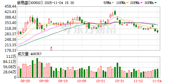 证券时报·数据宝统计显示,新易盛今日收盘价为293.00元,下跌2.33%,日换手率为5.29%,成交额为 138.79亿元,全天主力资金净流出11.34亿元,近5日该股累计下跌6.00%,近5日资金合计净流出2.21亿 元。 两融数据显示,该股最新融资余额为152.70亿元,近5日减少4.25亿元,降幅为2.71%。 机构评级来看,近5日共有2家机构给予该股评级,预计目标价最高的是国泰海通证券,11月18日国泰海 通证券发布的研报预计公司目标价为481.00元。(数据宝) 新易盛11月24日大宗交易平台出现一笔成交,成交量3.05万股,成交金额893.65万元,大宗交易成交价 为293.00元。该笔交易的买卖双方均为机构专用席位。 进一步统计,近3个月内该股累计发生7笔大宗交易,合计成交金额为1.25亿元。 11月24日新易盛大宗交易一览 | 成交量(万 | 成交金额(万 | 成交价格 | 相对当日收盘折溢价 | 买方营业 | 卖方营业 | | --- | --- | --- | --- | --- | --- | | 股) | 元) | (元) | (%) | 部 | 部 | | 3.05 | 893.6 ...