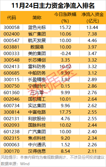 今日有10个行业主力资金净流入。 A股三大指数今日(11月24日)集体小幅上涨。行业板块多数收涨,船舶制造板块大涨,航天航空、互 联网服务、工程咨询服务、通信设备、游戏、软件开发、文化传媒板块涨幅居前,能源金属板块逆市大 跌。 从今日主力资金情况来看,沪深两市全天主力资金净流出130.24亿元。10个行业主力资金净流入,国防 军工、传媒行业主力资金净流入金额分别为24.98亿元、20.27亿元,远超其他行业;商贸零售、建筑装 饰、公用事业行业主力资金净流入金额均超2亿元。 21个主力资金净流出行业中,电子行业主力资金净流出金额居首,超40亿元;计算机、电力设备行业主 力资金净流出金额均超20亿元;基础化工、通信、医药生物、有色金属行业主力资金净流出金额均超10 亿元。 8股获主力资金 净流入均超3亿元 据证券时报·数据宝统计,从个股来看,21股主力资金净流入均超2亿元,8股获主力资金净流入均超3亿 元。 今日AI应用端持续走强,蓝色光标涨超15%,主力资金净流入13.44 亿元;省广集团涨停,主力资金净 流入7.38亿元。 机构表示,蓝色光标收入稳健增长,AI创收规模快速扩张,截至第三季度末,BlueAI平台 ...