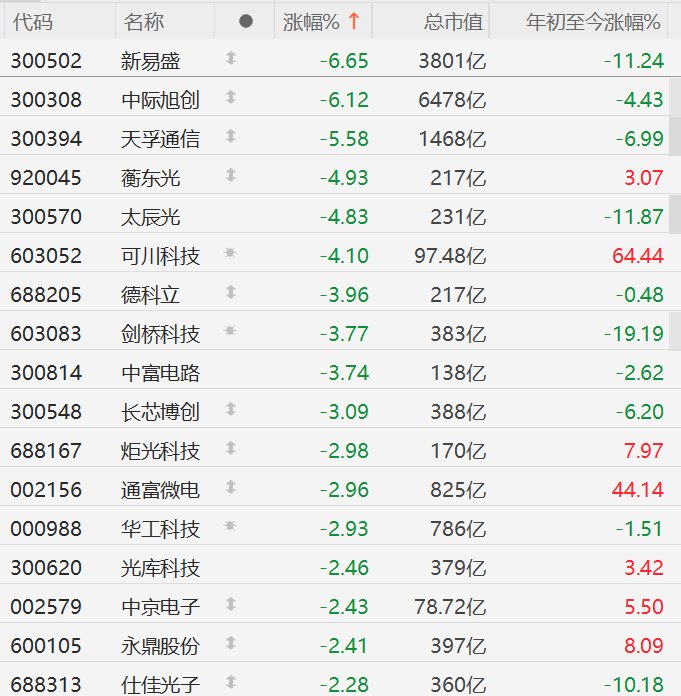 MACD金叉信号形成,这些股涨势不错! | 代码 | 名称 | | 涨幅% ↑ | 总市值 | 年初至今涨幅%。 | | --- | --- | --- | --- | --- | --- | | 300502 | 新易盛 | 1 | -6.65 | 3801亿 | -11.24 | | 300308 | 中际旭创 | 1 | -6.12 | 6478亿 | -4.43 | | 300394 | 天孚通信 | 1 | -5.58 | 1468亿 | -6.99 | | 920045 | 衛先光 | 1 | -4.93 | 217亿 | 3.07 | | 300570 | 太辰光 | | -4.83 | 231亿 | -11.87 | | 603052 | 可川科技 | 被 | -4.10 | 97.48亿 | 64.44 | | 688205 | 德科立 | 1 | -3.96 | 217亿 | -0.48 | | 603083 | 剑桥科技 | 美 | -3.77 | 383亿 | -19.19 | | 300814 | 中富电路 | | -3.74 | 138亿 | -2.62 | | 300548 | ...
