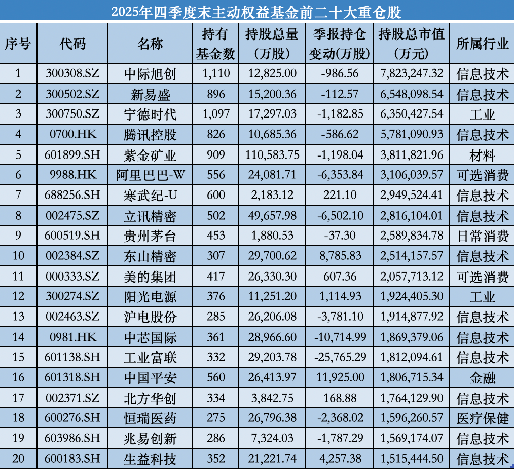 主动权益基金的头号重仓股易主。 截至1月23日,公募基金2025年四季度报告已全部披露完毕。据Wind数据统计,去年末,"易中天"三杰中的中际旭创(300308.SZ)、新易盛 (300502.SZ)已超越宁德时代(300750.SZ)、腾讯控股(00700.HK),成为主动权益基金(包括普通股票型基金、偏股混合型基金、平衡混 合型基金、灵活配置型基金)的前两大重仓股。 整体来看,2025年四季度主动权益基金的持仓变动呈现出从部分传统龙头与消费互联网板块向AI硬件、半导体等科技制造领域倾斜的趋势,机 构在年末进行了明显的结构再平衡。 | | | | | 2025年四季度末主动权益基金前二十大重仓股 | | | | | --- | --- | --- | --- | --- | --- | --- | --- | | 序号 | 代码 | 名称 | 持有 | 持股总量 | 李报持仓 | 持股总市值 | 所属行业 | | | | | 基金数 | (万股) | 变动(万股) | (万元) | | | 1 | 300308.SZ | 中际旭创 | 1,110 | 12,825.00 | -986.56 | 7,823, ...