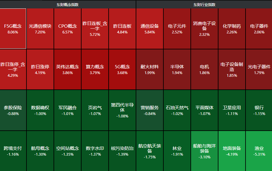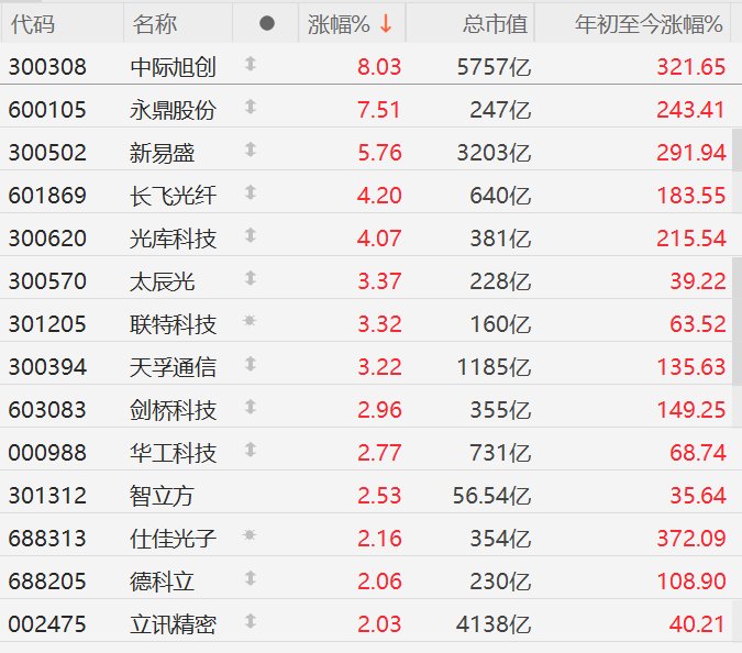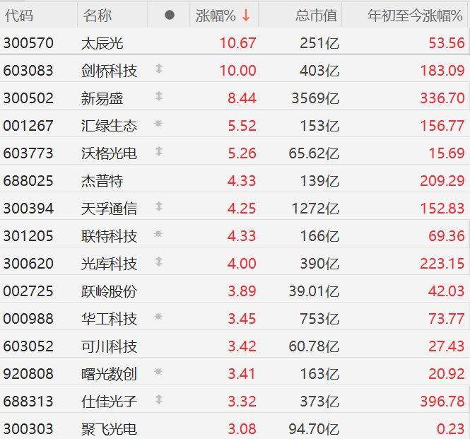 11月26日上午,A股市场震荡走强。截至午间收盘,上证指数涨0.14%,深证成指涨1.61%,创业板指大涨2.76%。 全市场半日成交额达1.14万亿元,较上日同期略有缩量;全市场超2800只个股上涨。 盘面上,上午通信板块大涨,"光的力量"持续火热,光模块、光通信、光芯片等概念股集体活跃,电子、医药生物、建筑材料等板块亦有涨幅;国防军 工、银行、传媒等板块回调。 | | | Wind热门概念指数 | | | --- | --- | --- | --- | | 光模块(CPO) 6.52% | 光芯片 4.80% | 光通信 4.33% | SPD 3.28% | | 智能音箱 3.31% | 培育钻石 3.48% | 海南自贸港 2.53% | 消费电子代工 2.86% | | 服务器 2.08% | 玻璃纤维 1.92% | 央企银行 -1.50% | 商业航天 -1.36% | | 大飞机 -1.64% | 深海科技 -1.43% | 年民融合 -1.86% | 军工信息化 -1.89% | | 十大军工集团 | 航母 | 水产 | 中船系 | | -2.24% | -3.10% | -3.96% | ...