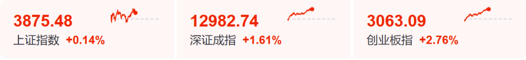 "易中天"大涨。 A股市场今天(11月26日)上午整体走强,主要股指低开高走,创业板指涨近3%。截至中午收盘,上证指数涨0.14%,深证成指涨1.61%,创业板指涨2.76%。盘面 上,通信板块大涨逾5%,成为上午A股市场主要亮点之一。 | 上证指数 | 深证成指 | 北证50 | | --- | --- | --- | | 3875.48 | 12982.74 | 1402.36 | | +5.45 +0.14% +205.43 +1.61% | | +5.53 +0.40% | | 科创50 | 创业板指 | 万得全A | | 1319.35 | 3063.09 | 6189.48 | | +17.19 +1.32% | +82.16 +2.76% +45.85 +0.75% | | | 沪深300 | 中证500 | 中证A500 | | 4527.22 | 7013.45 | 5441.06 | | +36.81 +0.82% | +58.85 +0.85% +48.15 +0.89% | | | 中证1000 | 深证100 | 中证红利 | | 7299.43 | 5709.57 | 5539.1 ...