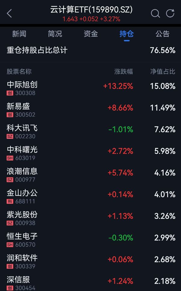Group 1 - The Zhongzheng Cloud Computing and Big Data Theme Index (930851) has shown strong growth, with notable increases in constituent stocks such as Zhongji Xuchuang (300308) up 14.48%, Xinyi Sheng (300502) up 10.61%, and Shiji Information (002153) up 10.00% [1] - The Big Data ETF (159739) has risen by 3.96%, with the latest price reported at 1.55 yuan [1] - The AI industry chain is experiencing a broad rally, particularly in computing hardware stocks, with active performance in AI applications [2] Group 2 - Meta is negotiating with Google to use TPU chips worth billions of dollars in its data centers by 2027, which could generate significant revenue for Google [2] - Alphabet recently achieved a quarterly revenue exceeding $100 billion for the first time in Q3 2025, marking a 16% year-on-year growth [2] - The total potential market size for Optical Circuit Switching (OCS) is expected to exceed $1.6 billion by 2029, driven by advancements in Google's AI processes [2] Group 3 - The Zhongzheng Cloud Computing and Big Data Theme Index includes 50 listed companies involved in cloud computing services, big data services, and related hardware, reflecting the overall performance of these sectors [3] - As of October 31, 2025, the top ten weighted stocks in the index account for 61.58% of the total, including Zhongji Xuchuang (300308), Xinyi Sheng (300502), and Keda Xunfei (002230) [3]