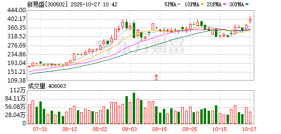 交易行情显示,10月27日,新易盛高开4.57%,开盘后公司股价震荡上行,盘中股价涨超8%,触及 405.62元/股高点,创下历史新高。截至北京商报记者发稿,新易盛股价涨幅7.46%,报400.8元/股,总 市值3972亿元。 北京商报讯(记者 马换换 王蔓蕾)10月27日,新易盛(300502)高开高走,盘中股价创历史新高。 ...